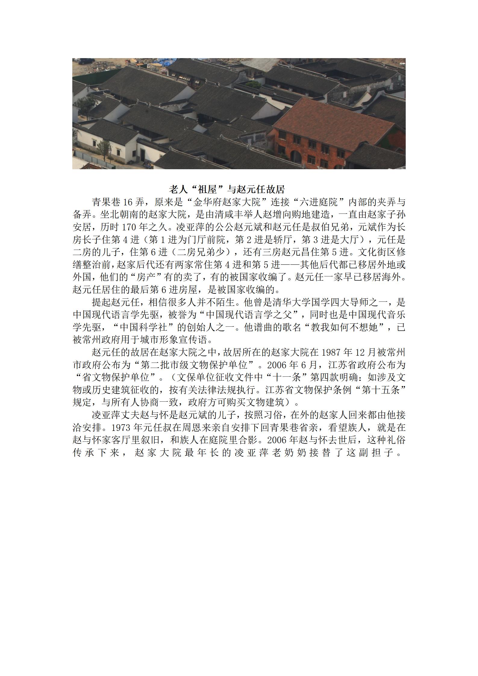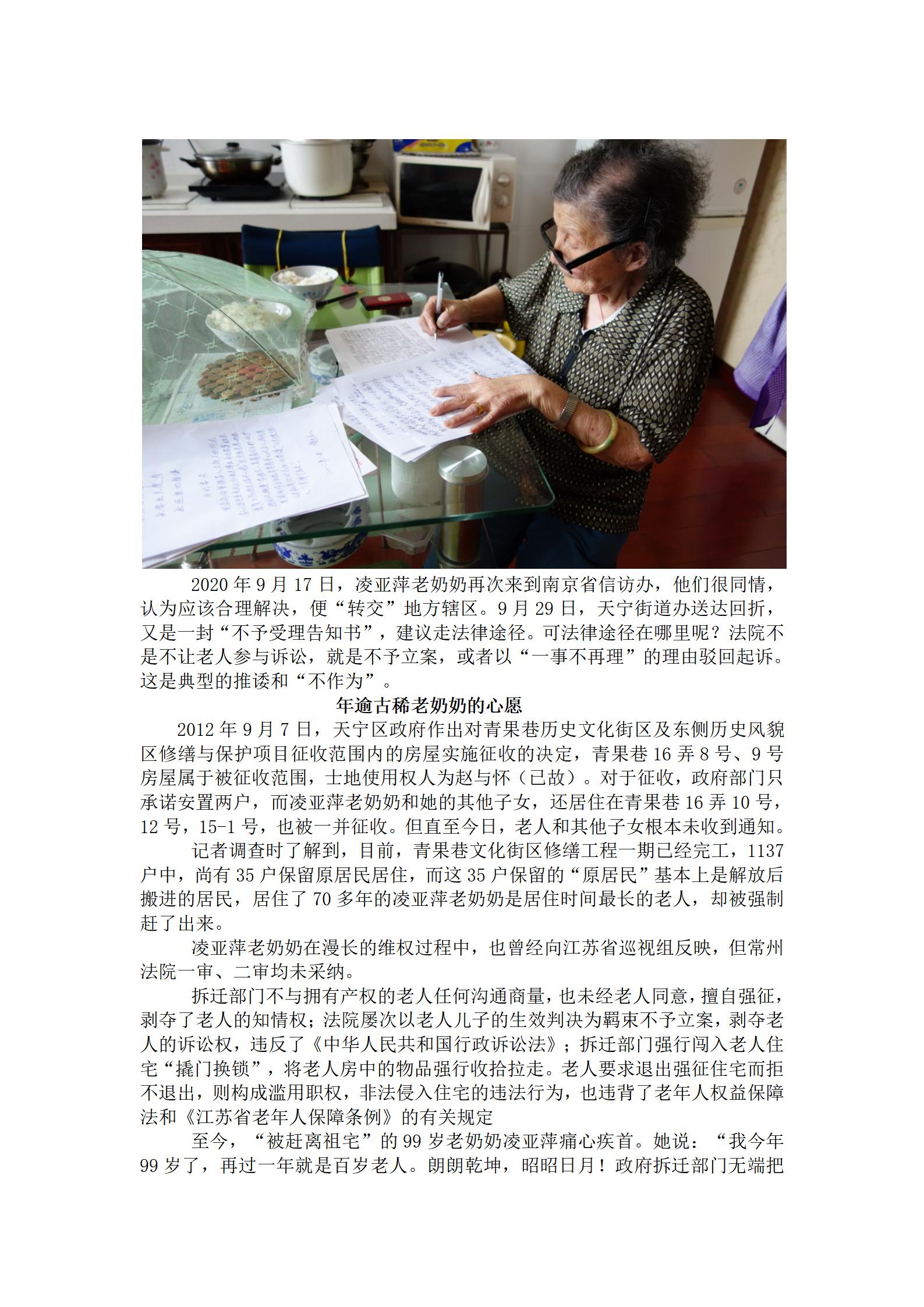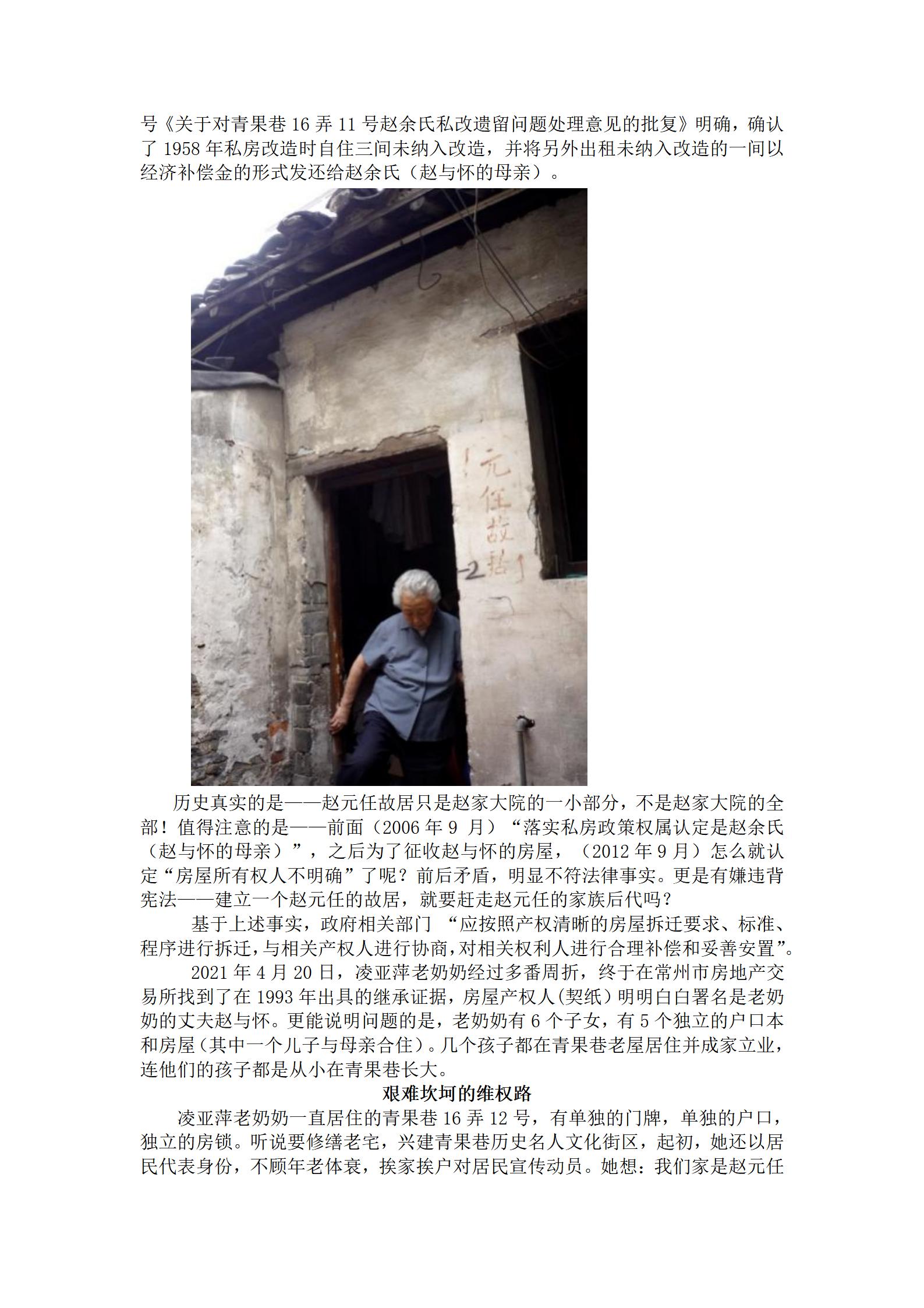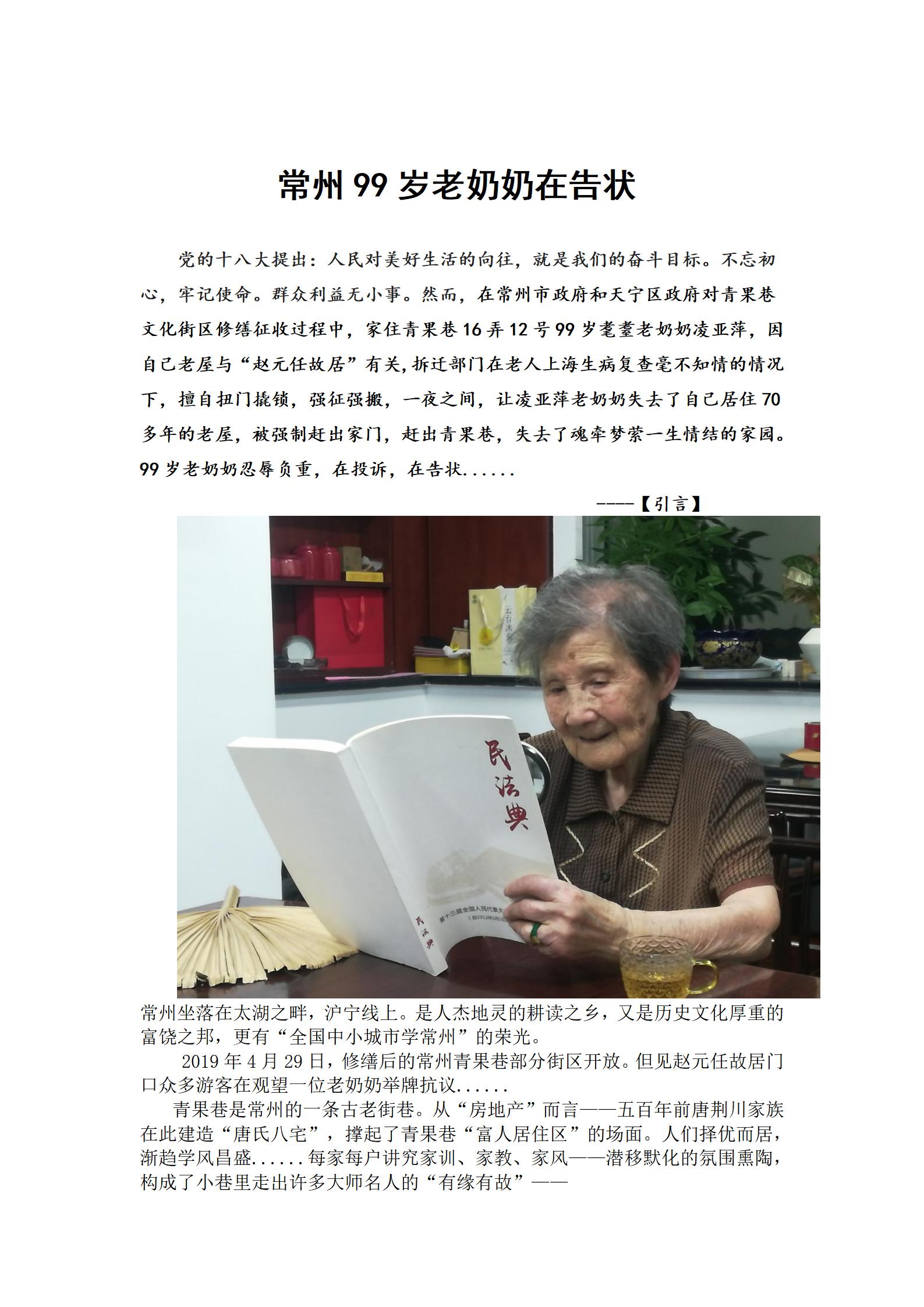 在常州市政府和天宁区政府对青果巷文化街区修缮征收过程中,家住青果巷16弄12号99岁耄耋老奶奶凌亚萍,因自己老屋与“赵元任故居”有关,99岁老奶奶忍辱负重,在投诉,在告状......